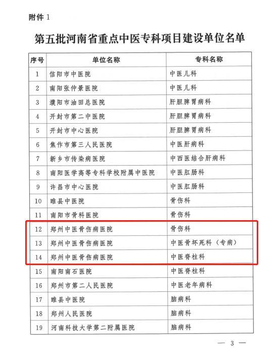 根据《河南省中医药管理局关于确定第五批河南省重点中医专科项目建设单位的通知》,2019年确定郑州中医骨伤病医院3个河南省重点中医专科建设项目,分别是:骨伤科、中医骨坏死科(专病)、中医脊柱科。