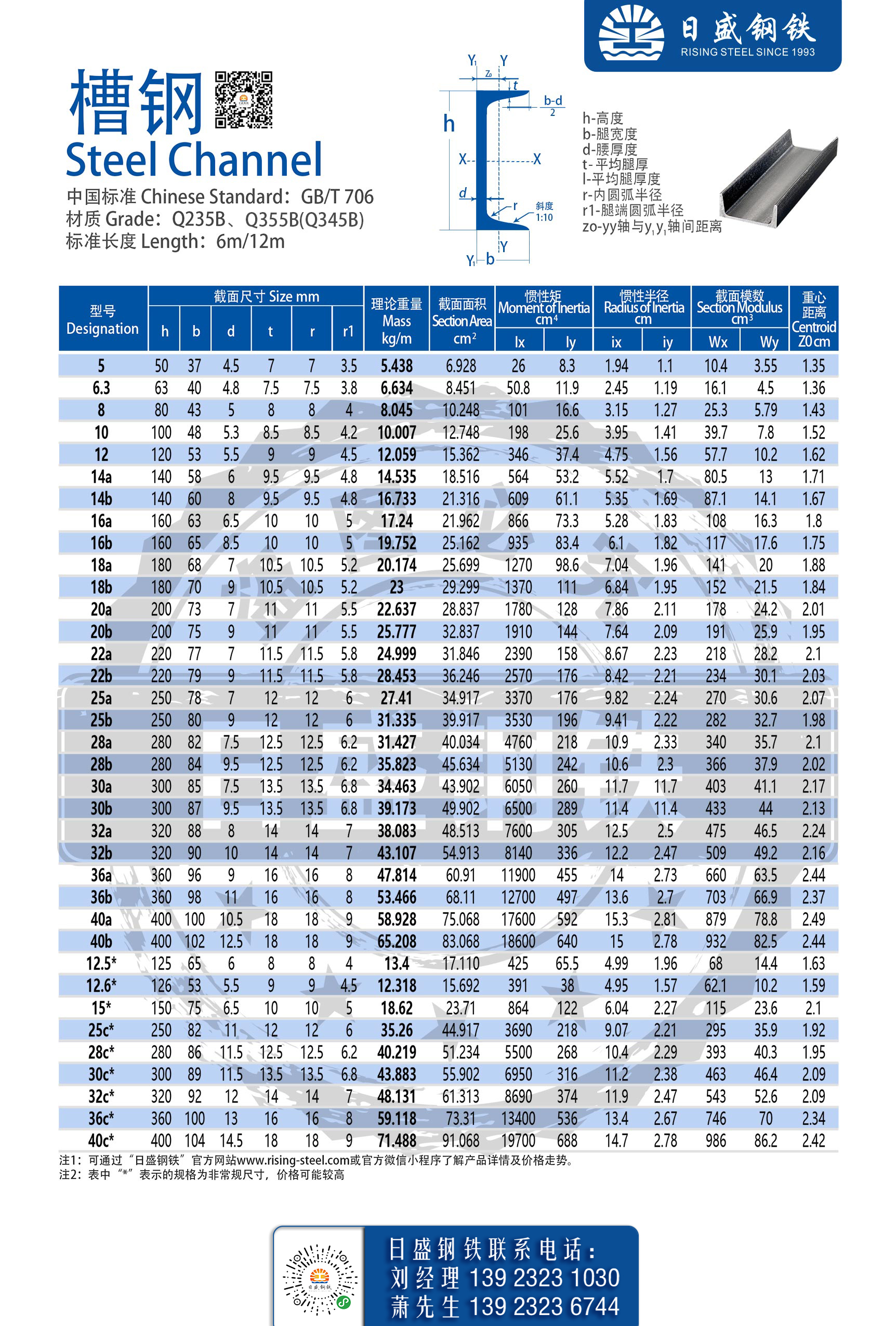大家可以看到,槽钢的规格不如H型钢和工字钢多,但是槽钢的参数并不比它们少,当然了,这两者并没有实际关系,因为他们的用途各有不同,槽钢主要用于建筑结构、幕墙工程、机械设备和车辆制造等,还会经常和工字钢配合使用。