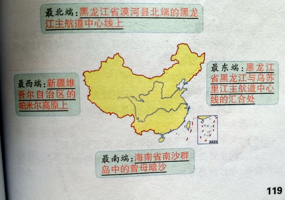 最东端: 135° E多,黑龙江与乌苏里江主航道中心线的相交处: