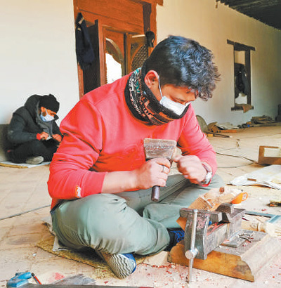 在九层神庙修复项目现场,尼泊尔工匠正在雕刻神像。 中国文化遗产研究院供图