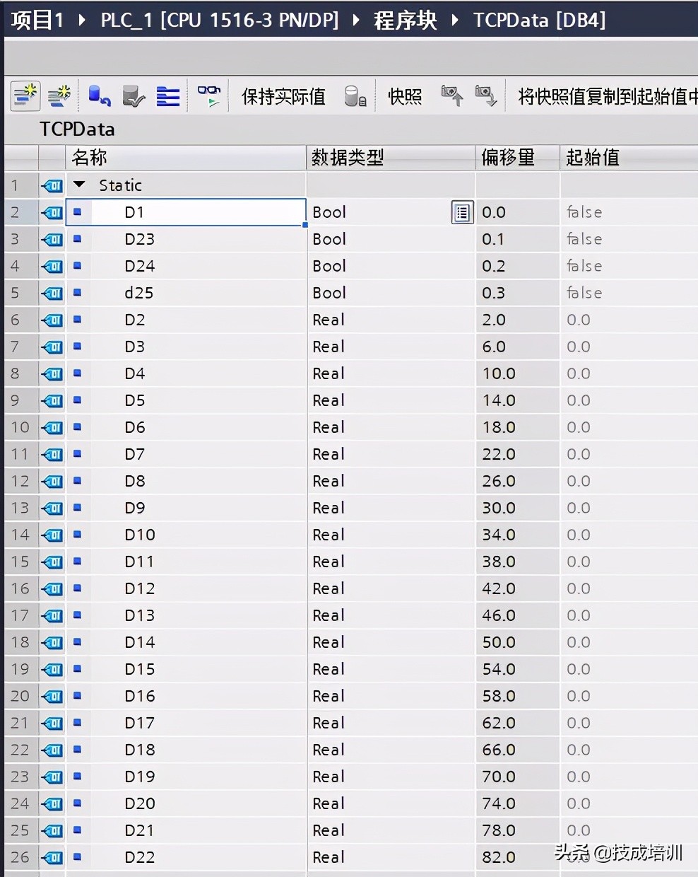 通信地址是有效地址,这句话该怎么去理解呢?因为PLC大多数是基于存储区的,每个地址肯定是隶属于某个存储区,大家都知道西门子PLC自带的存储区有I区、Q区、M区、T区、C区,但是对于常用的DB存储区是没有的,需要自己去创建,也就意味着,如果你要读取DB地址,必须要提前创建好DB存储区,除此以外,DB存储区创建之后,默认是没有字节的,需要自己一个个添加变量,才能形成有效存储区,因此一个DB存储区的范围是有限并且可见的(可以通过偏移量看出来)。举例说明,下图是一个DB存储区,说明这个存储区有86个字节,如果你通信的地址超过这个范围,肯定就会出问题。这点其实也很容易理解,我们把与PLC通信当做从服务器拿东西,如果我们要拿的东西,服务器都没有,那么是不是会出问题呢?