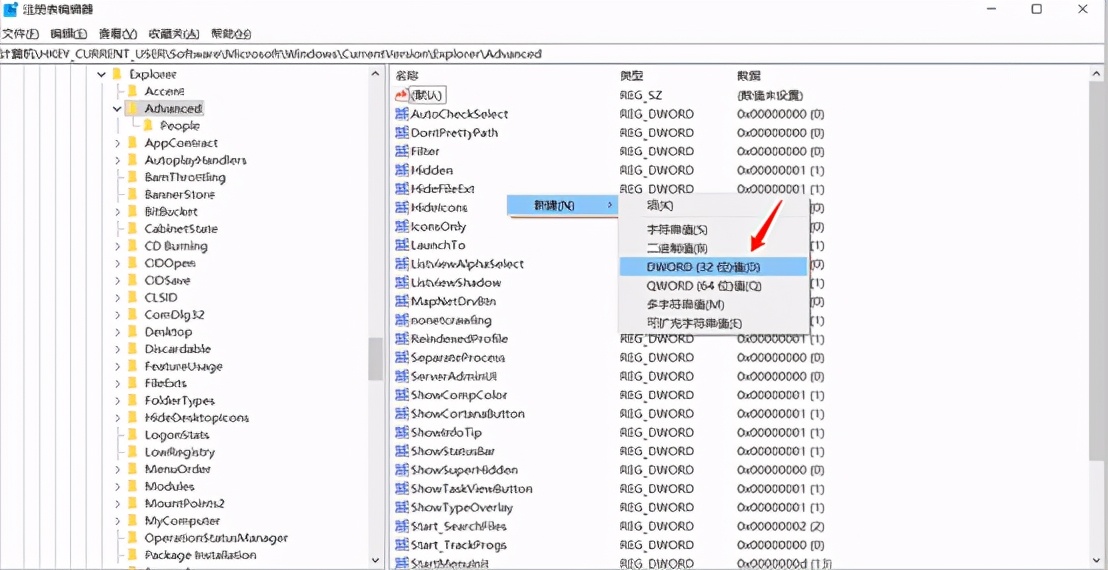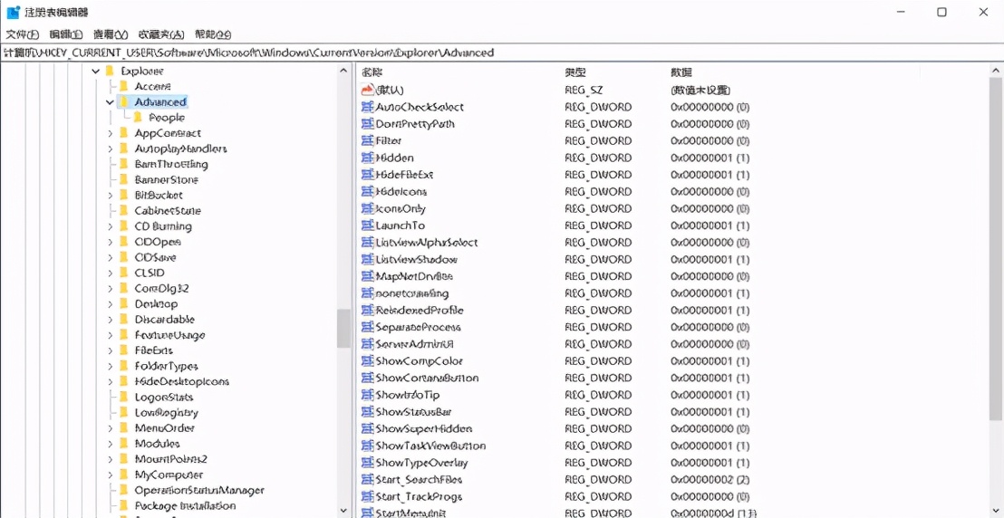 HKEY_CURRENT_USERSoftwareMicrosoftWindowsCurrentVersionExplorerAdvanced。
