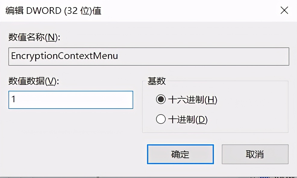 将新建文件命名为“EncryptionContextMenu”,双击文件进入,选择十六进制,将数值数据设置为1。