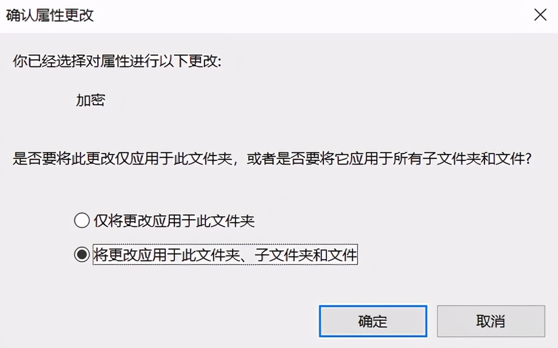 确认属性更改,可以选择仅将更改应用于此文件夹,也可选择将更改应用于此文件夹、子文件夹和文件,选择完毕后点击“确认”。