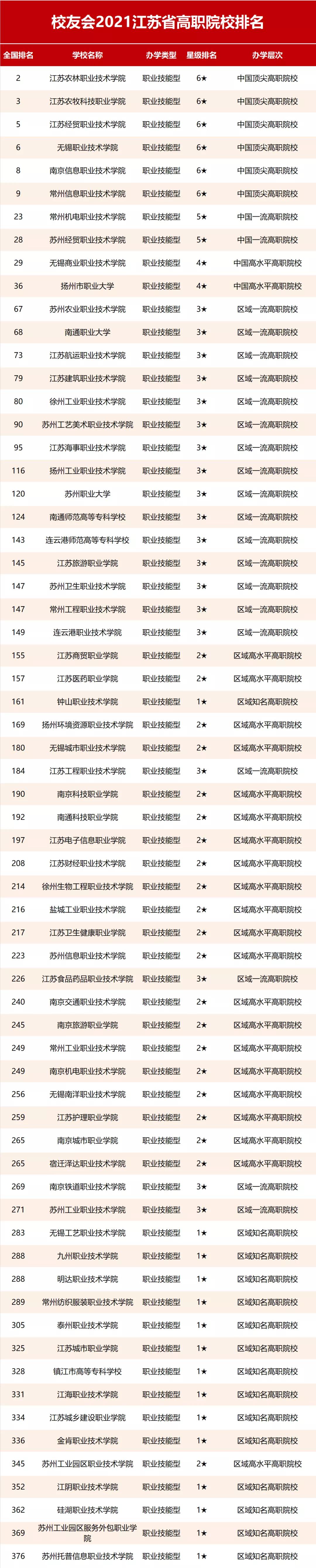 在校友会2021中国高职院校排名中,江苏农林职业技术学院全国排名第2名,雄居2021校友会江苏省高职院校排名第一;江苏农牧科技职业学院全国排名第3名,居第2;江苏经贸职业技术学院全国排名第5名,居第3。名列江苏省高职院校前10名的其他院校是无锡职业技术学院(第6名)、南京信息职业技术学院(第8名)、常州信息职业技术学院(第9名)、常州机电职业技术学院(第23名)、苏州经贸职业技术学院(第28名)、无锡商业职业技术学院(第29名)、扬州市职业大学(第36名)。