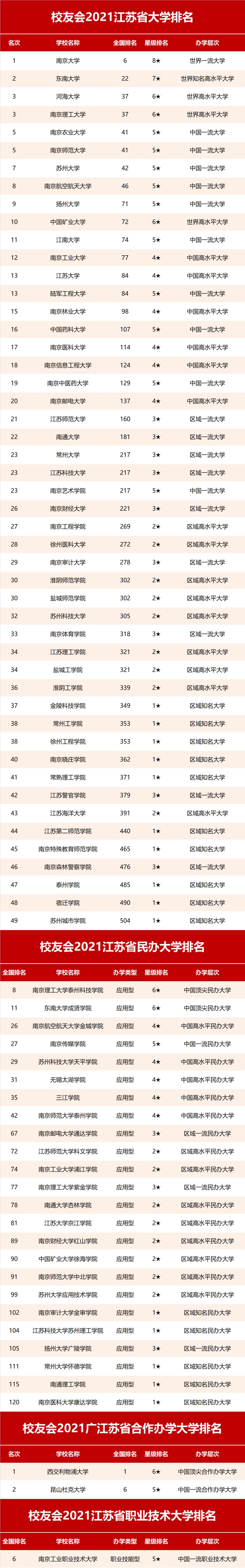 在最新2021中国华东地区大学排名中,南京大学、东南大学、河海大学、南京理工大学、南京农业大学、南京师范大学雄居校友会2021江苏省大学排名前5强。南京理工大学泰州科技学院、东南大学成贤学院、南京航空航天大学金城学院名列2021江苏省民办大学排名前3强,江苏农林职业技术学院、江苏农牧科技职业学院、江苏经贸职业技术学院名列2021江苏省高职院校排名前3甲。西交利物浦大学雄居2021江苏省合作办学大学排名第一,南京工业职业技术大学雄居2021江苏省职业技术大学排名第一。