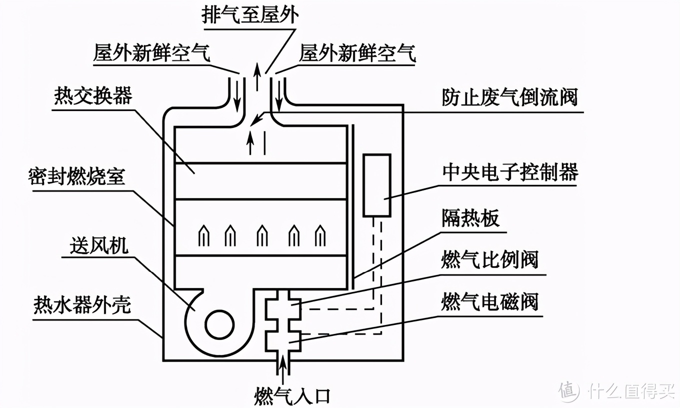⑤强制给排式热水器工作时所需的空气和排放的废烟气通过烟道和排风扇的作用,形成对空气的强制对流而排放于室外。