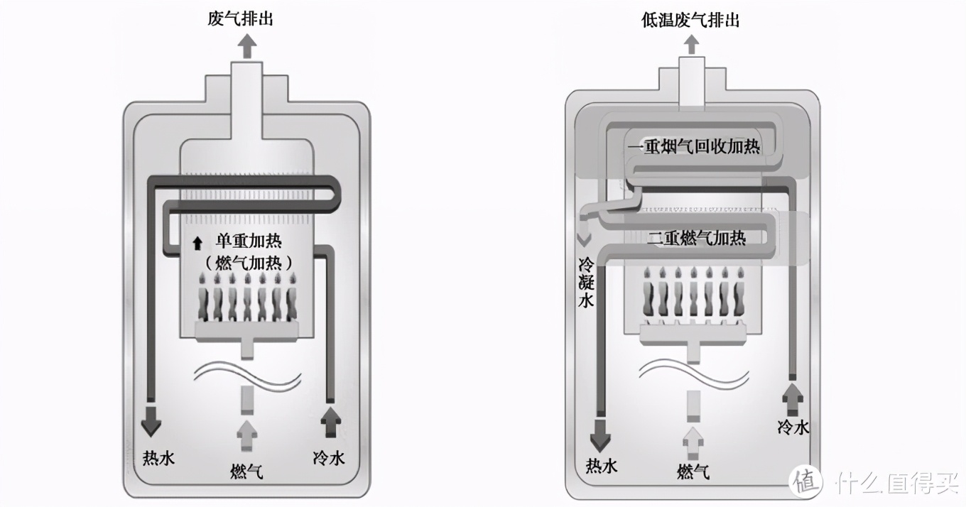 现在家庭普遍使用的燃气快速热水器只有一个换热器,普通燃气快速热水器。通常称为“单核”,冷水经过换热器吸收燃烧器产生的热量后,流出热水,燃烧产生的大量高温烟气未经利用直接由烟道排出,白白浪费了大量热能;双热核冷凝式快速燃气热水器,它采用了两个换热器,通常称其为“双核”,充分利用了燃烧后的烟气所产生的热能。