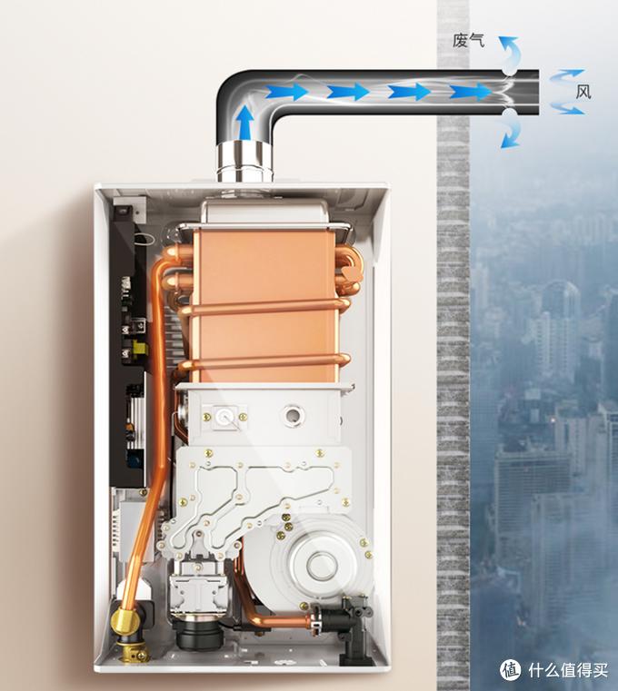 ③强制排放式热水器工作时所需的空气取自室内,排放的废烟气通过烟道和排风扇的作用将其强制排至室外。