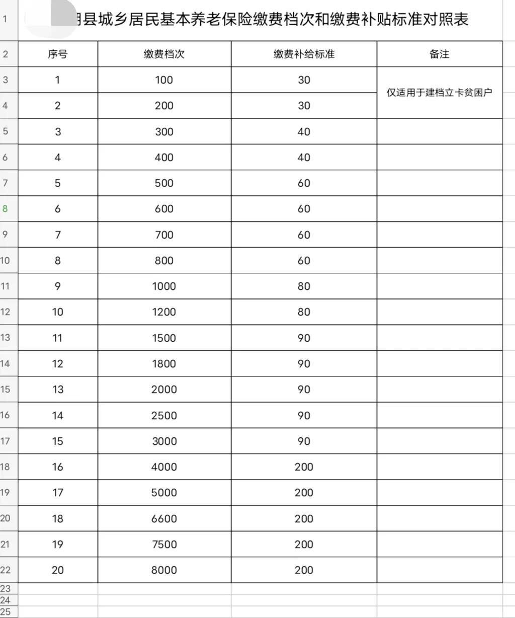 二、城乡居民养老保险的缴费档次设为每年的100元、200元、300元、400元、500元、600元、700元、800元、1000元、1200元、1500元、1800元、2000元、2500元、3000元、4000元、5000元、6600元、7500元、8000元共20个档次。(各地方有所不一样,有的地方最高档次只到5000元)。