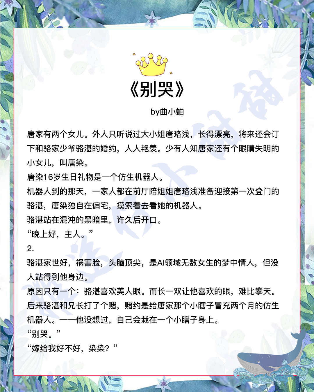 书评:因车祸失明的唐染在多年后再次与骆湛有了一面之缘,而此时的骆湛虽然忘了唐染,但是却对梦中的美人眼念念不忘。唐染回归唐家后,骆湛即将升级成了自己姐姐的未婚夫,而骆湛也假冒骆修之名接近唐染。之后骆湛因为自家团队的失误,假扮唐染的AI仿生机器人,两人在朝夕相处下感情逐渐升温,骆湛找回记忆,而唐染的身世也逐渐明朗。