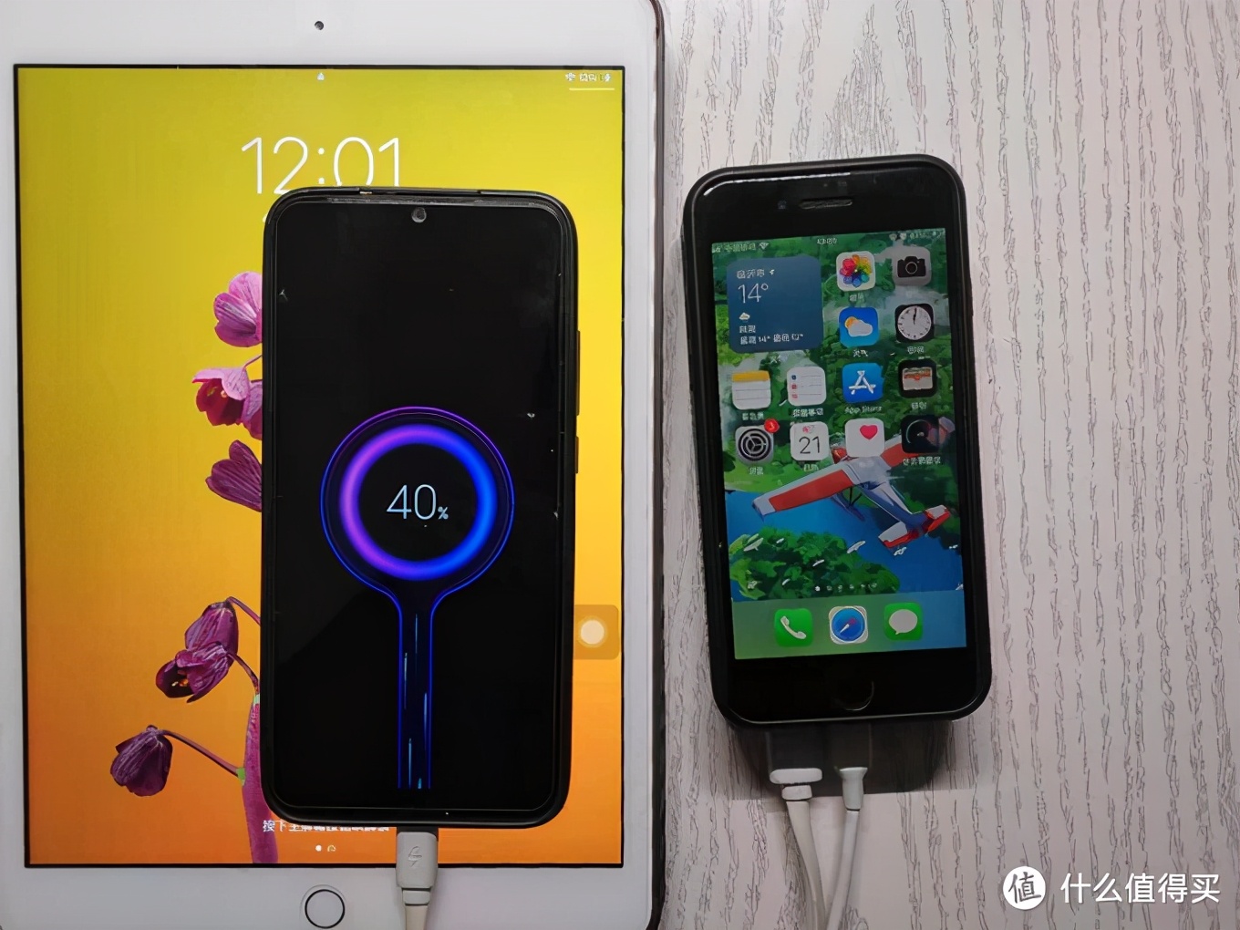 使用这个充电宝可以同时为多个设备进行有线充电和无线充电,下图中为ipad 2020(C-to-L供电)、红米7(USB-A供电)和iphone se2(无线充电),总输出可达22.5w
