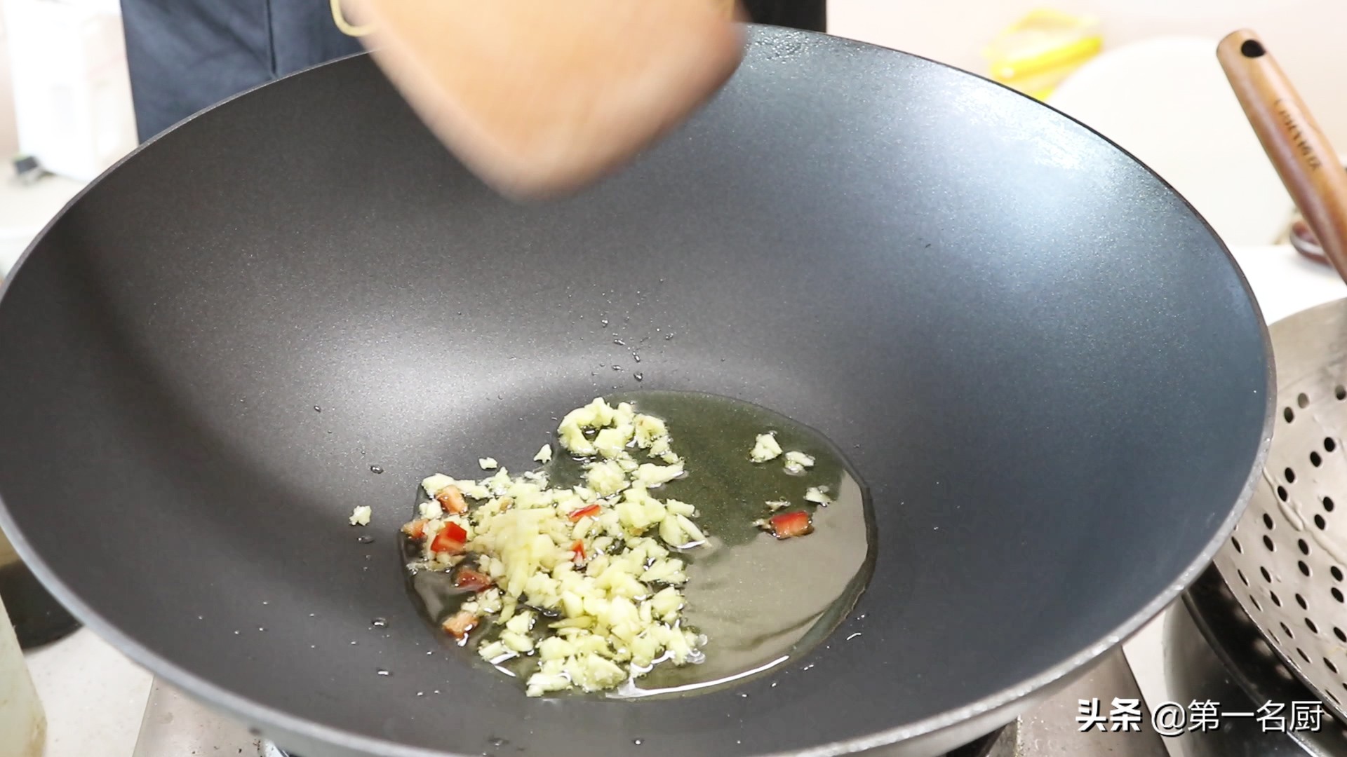 8.重新起锅添入少许食用油,油热后放入蒜蓉炒香。