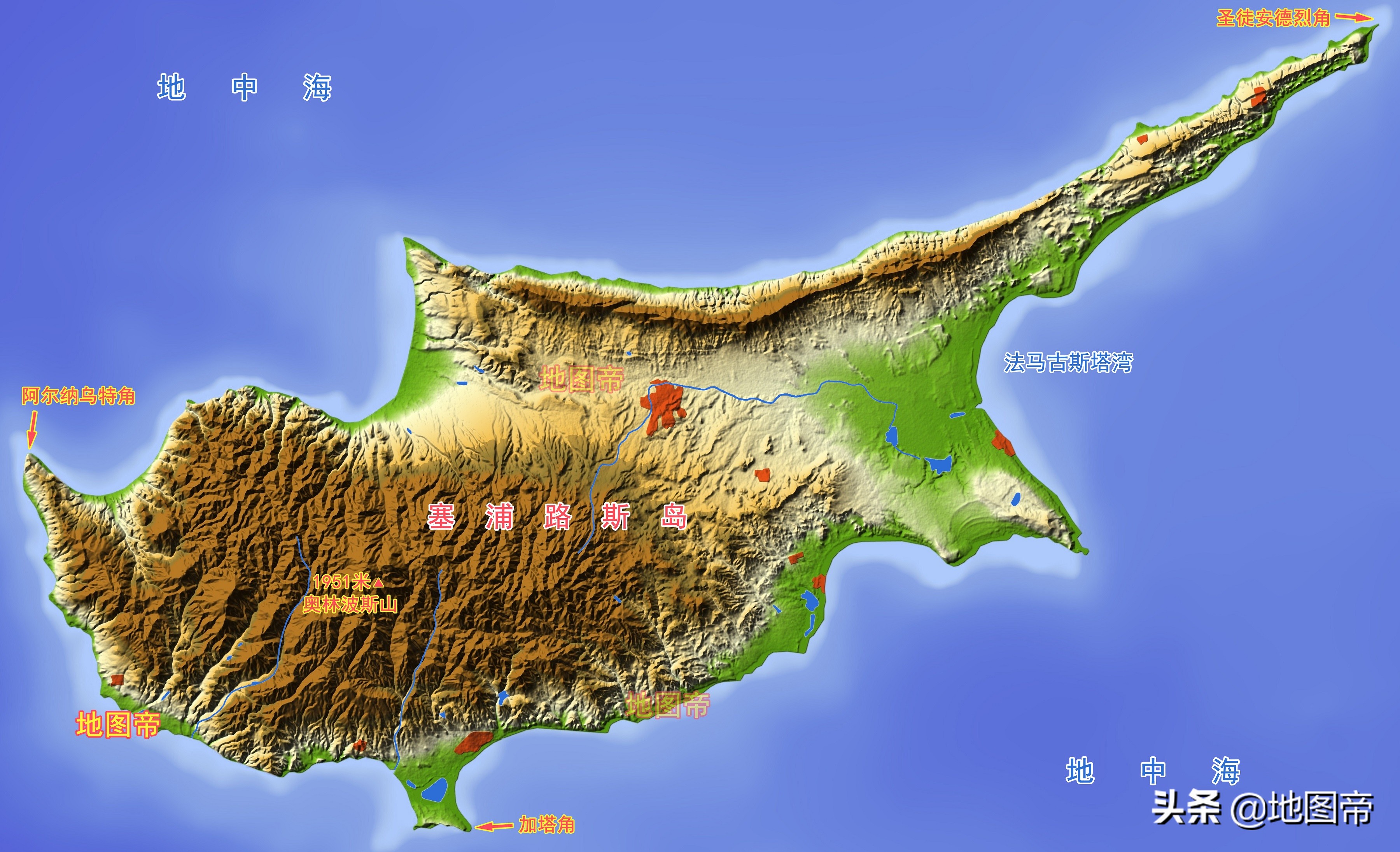 塞浦路斯岛,东西长约240千米,南北宽约100千米,面积约9251平方千米,是地中海第三大岛,约为海南岛的27.20%。
