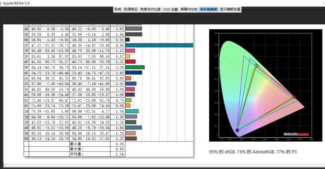 我们通过红蜘蛛校色仪检测来看,这款产品色域为95%sRGB、73%AdobeRGB,色准为1.54。也就是说这块屏幕能为用户提供出色的日常观感,并且对于修图、视频剪辑一类的专业需求也非常合适。