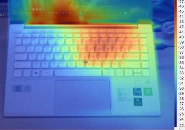 在双烤之后(此时室温23摄氏度),通过热力仪来看,整机正面最高温度47.2摄氏度,WASD键、腕托、触控板处温度适中,基本无热感。也就是说,保守的性能释放带来了更好的温度控制和更低的噪声。