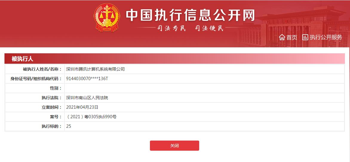 4月23日,深圳市腾讯计算机系统有限公司(以下简称“腾讯”)被深圳市南山区人民法院列为被执行人,案号为(2021)粤0305执6990号,执行标的为25元。