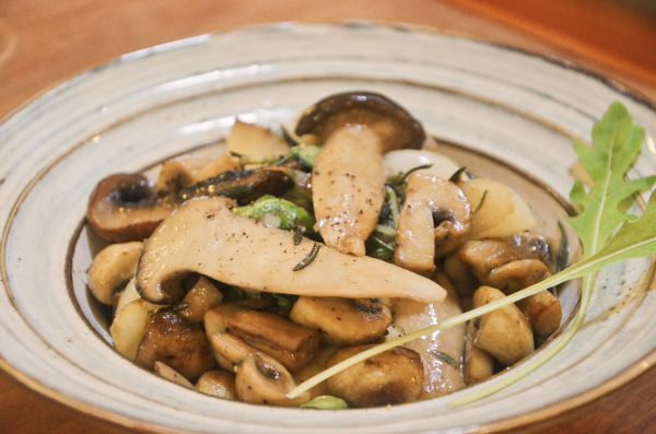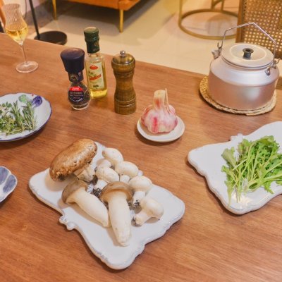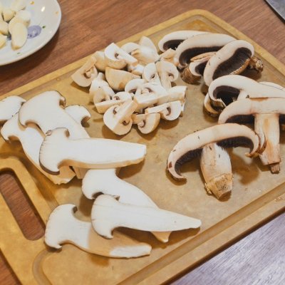 2、波多黎各菌、杏鲍菇切片,白蘑菇切块。 大蒜对半切。