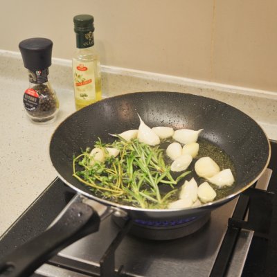 4、将大蒜丢进去轻微炒一下,再将新鲜的迷迭香、百里香拌炒
