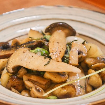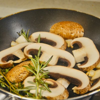5、炒香后将小蘑菇宝宝们和香草拌炒