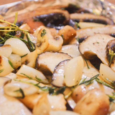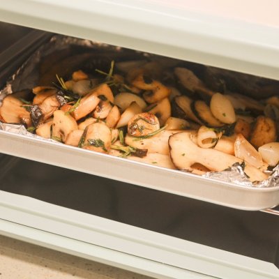 7、烤箱预热到170度,将盐、黑胡椒碎和剩下一半橄榄油均匀撒在烤盘中的小蘑菇上,拌匀摊平后放入烤箱,烤10-12分钟(烤5-6分钟时取出翻拌均匀继续烤)到熟了以后取出来晾凉。