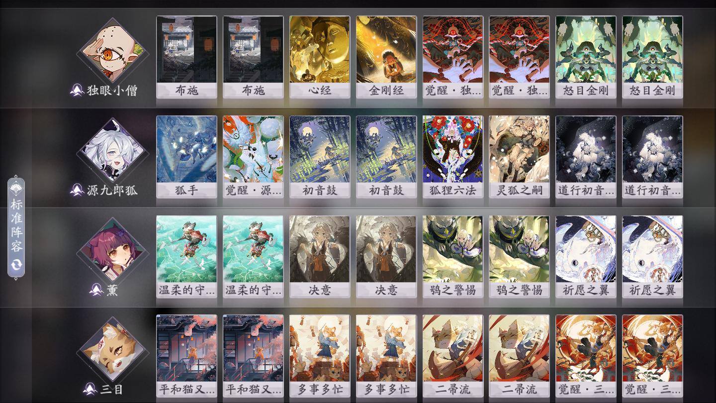 阵容名: 独眼小僧 怒目金刚 (2) 布施 (2) 心经 (1) 金刚经 (1) 觉醒·独眼小僧 (2) 源九郎狐 狐手 (1) 觉醒·源九郎狐 (1) 初音鼓 (2) 狐狸六法 (1) 灵狐之嗣 (1) 道行初音旅 (2) 薰 温柔的守护 (2) 决意 (2) 鸮之警惕 (2) 祈愿之翼 (2) 三目 二帚流 (2) 平和猫又屋 (2) 觉醒·三目 (2) 多事多忙 (2) 阵容码:Ml8xMDVfMzU4NTE0NF8xNjE2OTQyODE5fHp4AAACAAAAIiEBACohAQAyIQEAHiEBAKoiAQCuIgEAtiIBAL4iAQDiJQEAxiUBAMklAQDRJQEA1iUBAFVAAQBdQAEAZkABAGlAAQBxQAEAdkABAA==