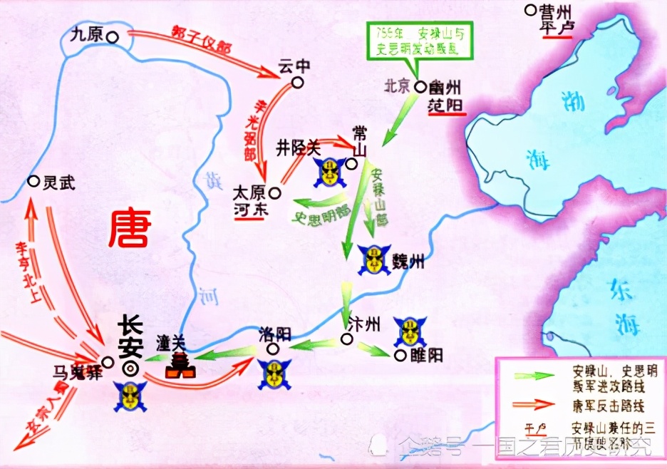 安史之乱军事示意图,这也是后来史家和诗家心中永远的痛,包括李白杜甫等。(本文由搜索作者泊东原创)