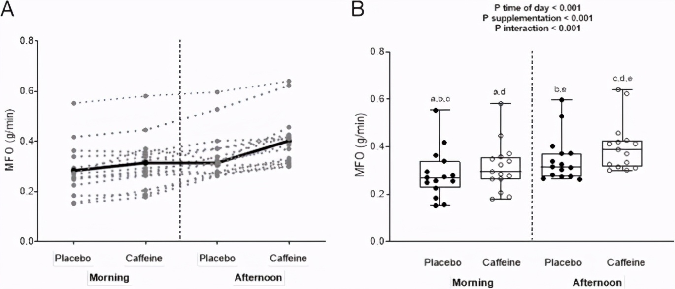 结果显示,与安慰剂相比,咖啡因摄入无论是上午还是下午都显著增加了运动最大脂肪氧化率(maximal fat oxidation,MFO),达到MFO的运动强度( the intensity of exercise that elicits MFO ,Fatmax)。
