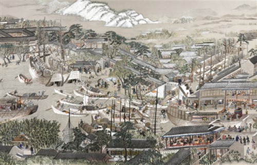 该绣品基于苏州籍宫廷画家徐扬创作的《盛世滋生图》,根据原画作的构图和色彩,灵活运用了接针、缠针、铺针等十几种传统苏绣针法,500余种各色丝线,将原画中250年前苏州的湖光山色、民俗风情等都纤毫毕显地精绣出来,真实生动地再现了原画作的神韵气象,写尽了乾隆盛世时姑苏的繁华景象,被绣界称作“稀世神品”。