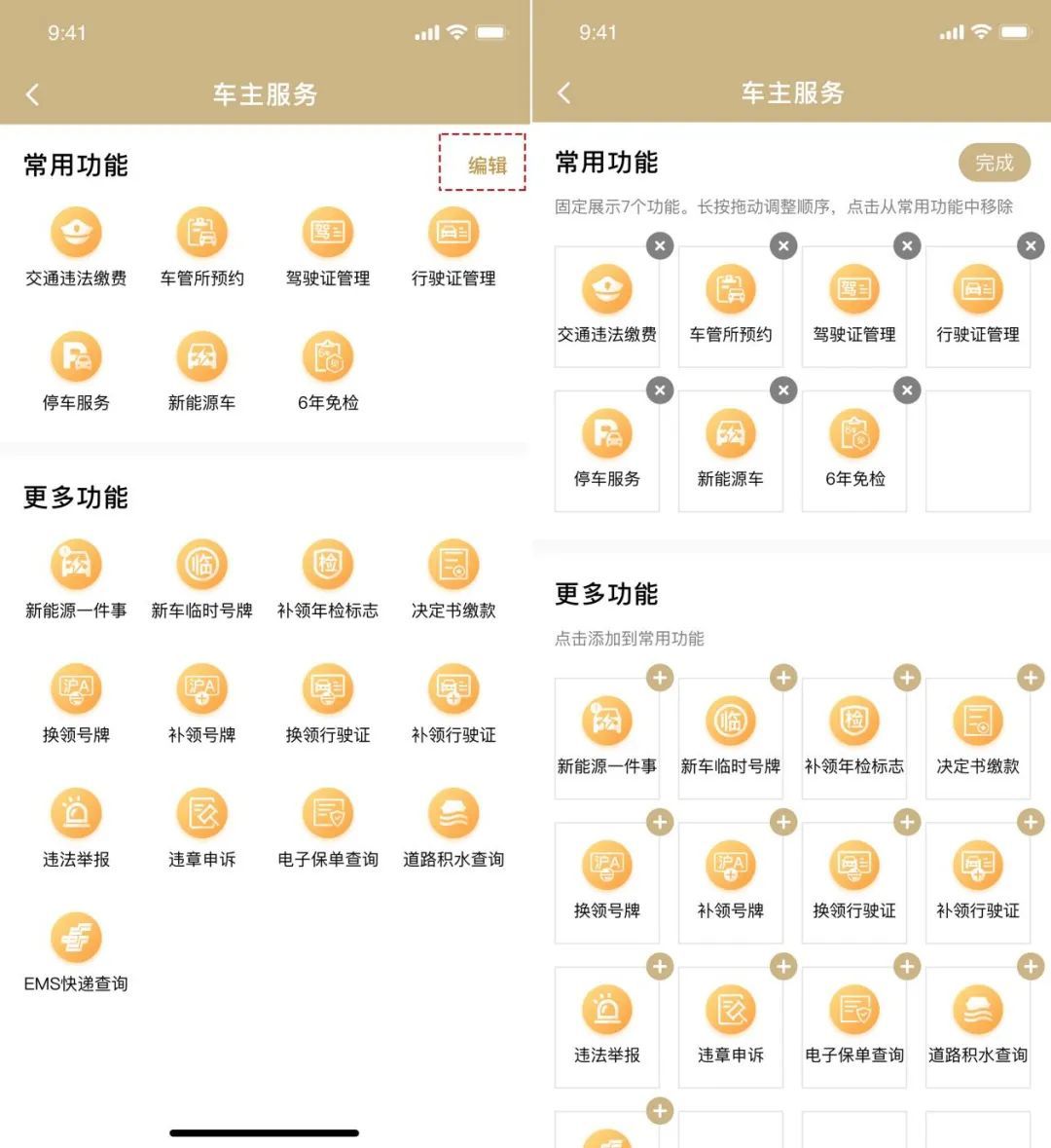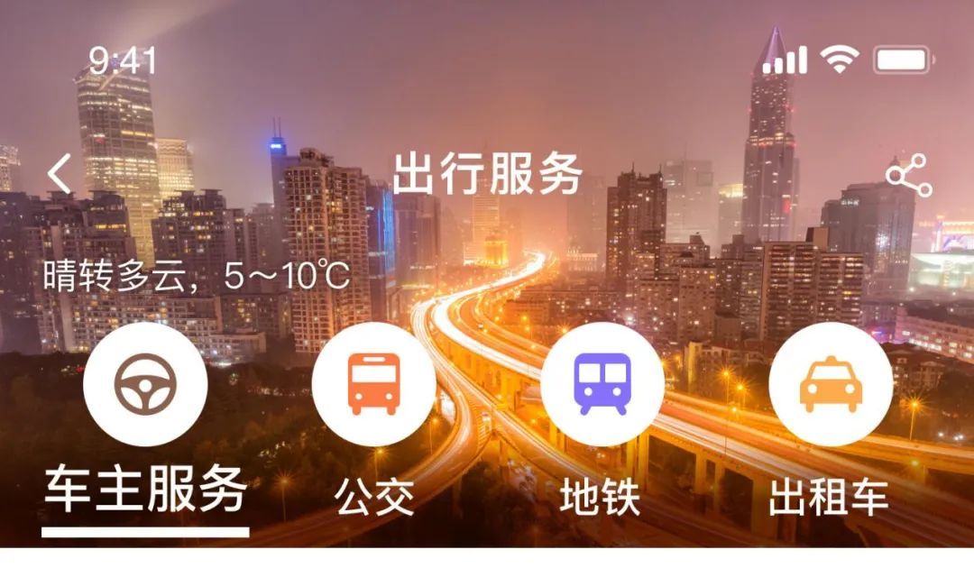 在新版中,当系统判断你为“车主”身份后,在“出行服务”页面中,将展示“车主服务”私人定制版页面,为你提供以下服务: