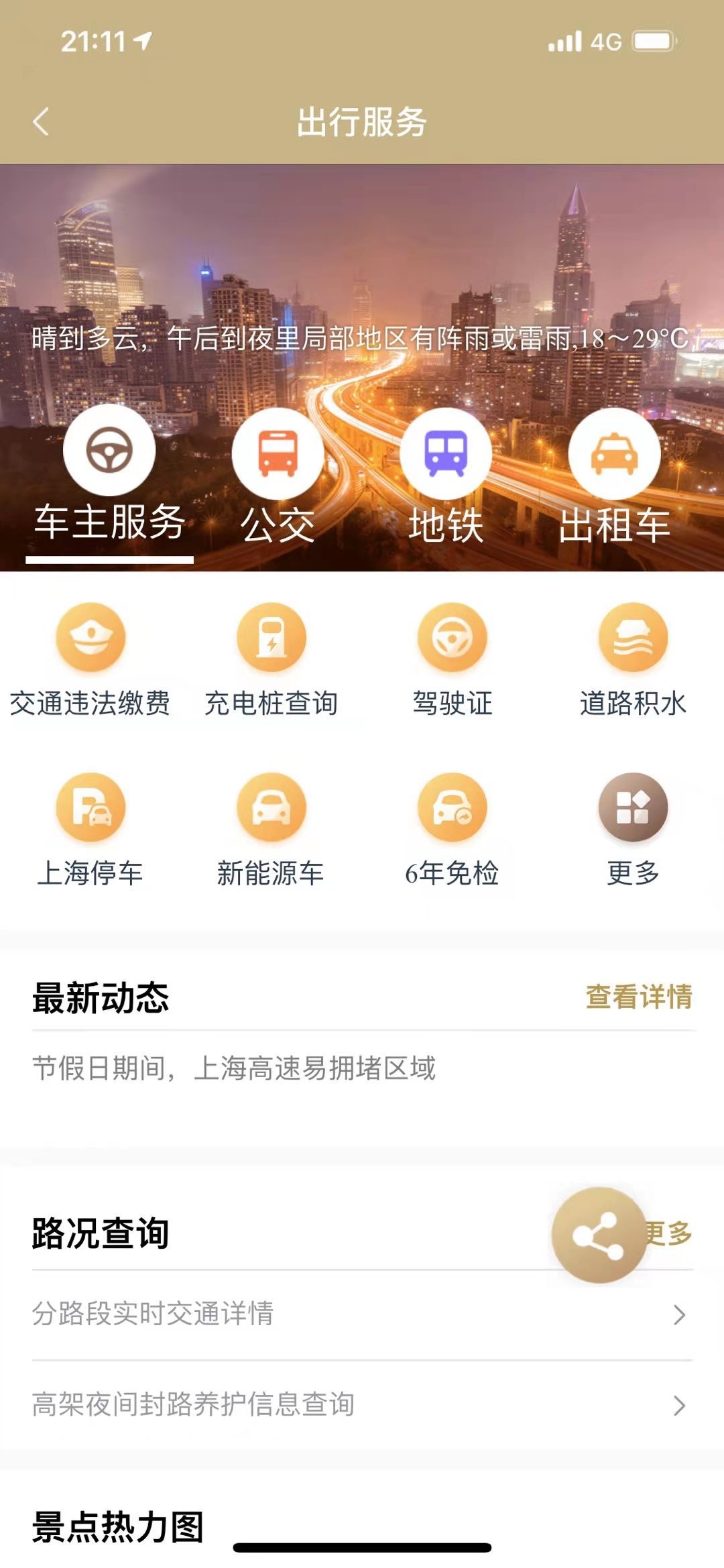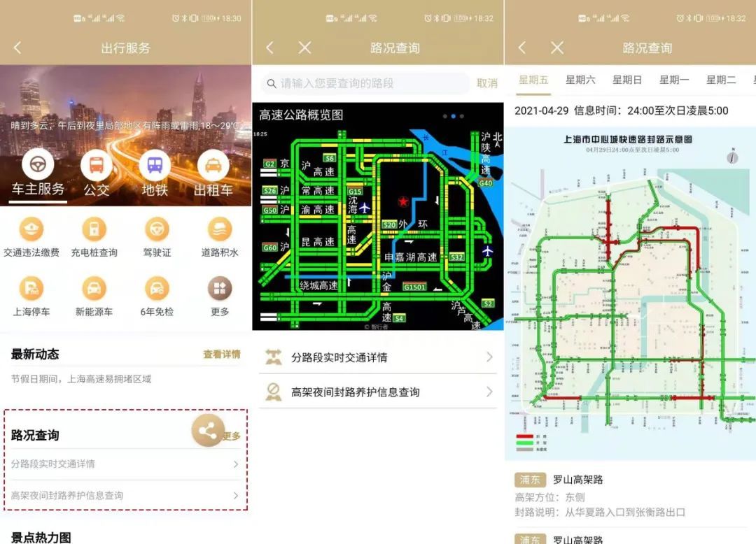 点击分路段实时交通详情及高架夜间封路养护信息查询直接进入对应的服务