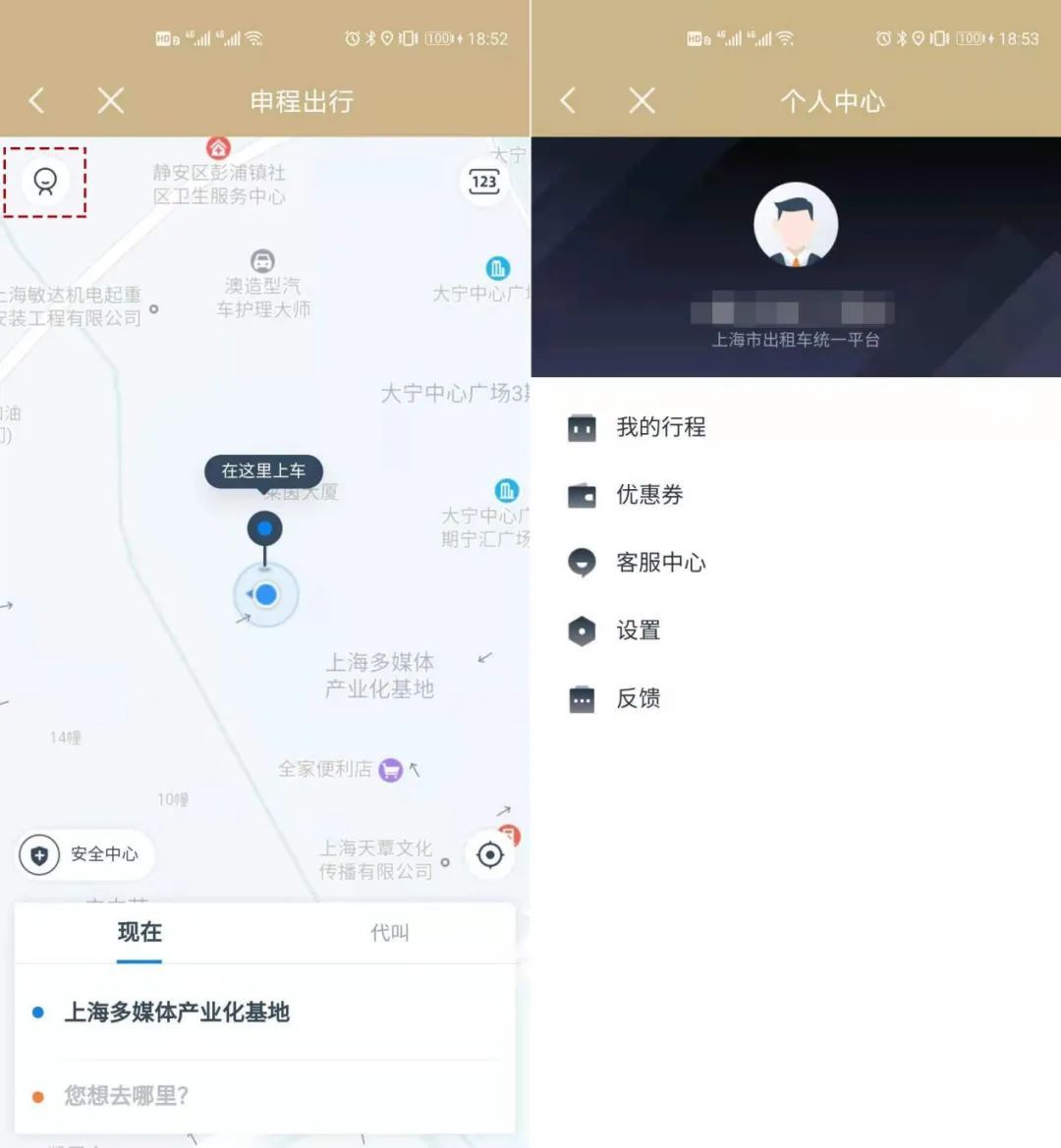 点击服务页面左上方图标,即可进入“个人中心”。可查询到你的行程记录、优惠券、个人中心等信息。