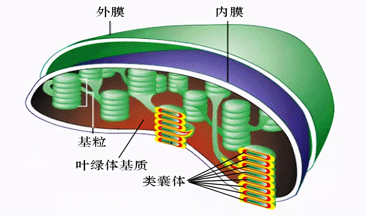 叶绿体内部由内膜发展而来的封闭的扁平膜囊,称为类囊体。类囊体囊内空间称为类囊体腔。在叶绿体的某些部位,许多圆饼状的类囊体有序堆叠成垛,称为基粒。一个叶绿体含有40~60个甚至更多的基粒,一个基粒由5~30个类囊体组成,最多可达上百个。组成基粒类囊体的数目,依不同植物或同一植物不同部位的细胞而有很大变化。类囊体堆叠成基粒,是高等植物细胞所特有的膜结构,这种结构大大增加了膜片层的总面积,能更有效地捕获光能,加速光反应。类囊体腔彼此相通,因而一个叶绿体内的全部类囊体实际上是一个完整连续的封闭膜囊,使膜系统的膜囊与基质隔开,这在电化学梯度的建立和ATP的合成中起重要作用。类囊体膜的化学组成与细胞的其他膜成分不同,含极少的磷脂和丰富的具有半乳糖的糖脂,这些脂质中的脂肪酸主要是不饱和的亚麻酸,约占87%。因此,类囊体膜的脂双分子层流动性非常大。脂双分子层的流动性促进光合作用过程中类囊体膜上的光系统Ⅱ、 细胞色素b6/f复合物、光系统I及 ATP合酶复合物在膜上的侧向移动,有利于光合作用的进行。此外,类囊体膜上的蛋白质/脂质比很高,这也与叶绿体行使光合作用有关。