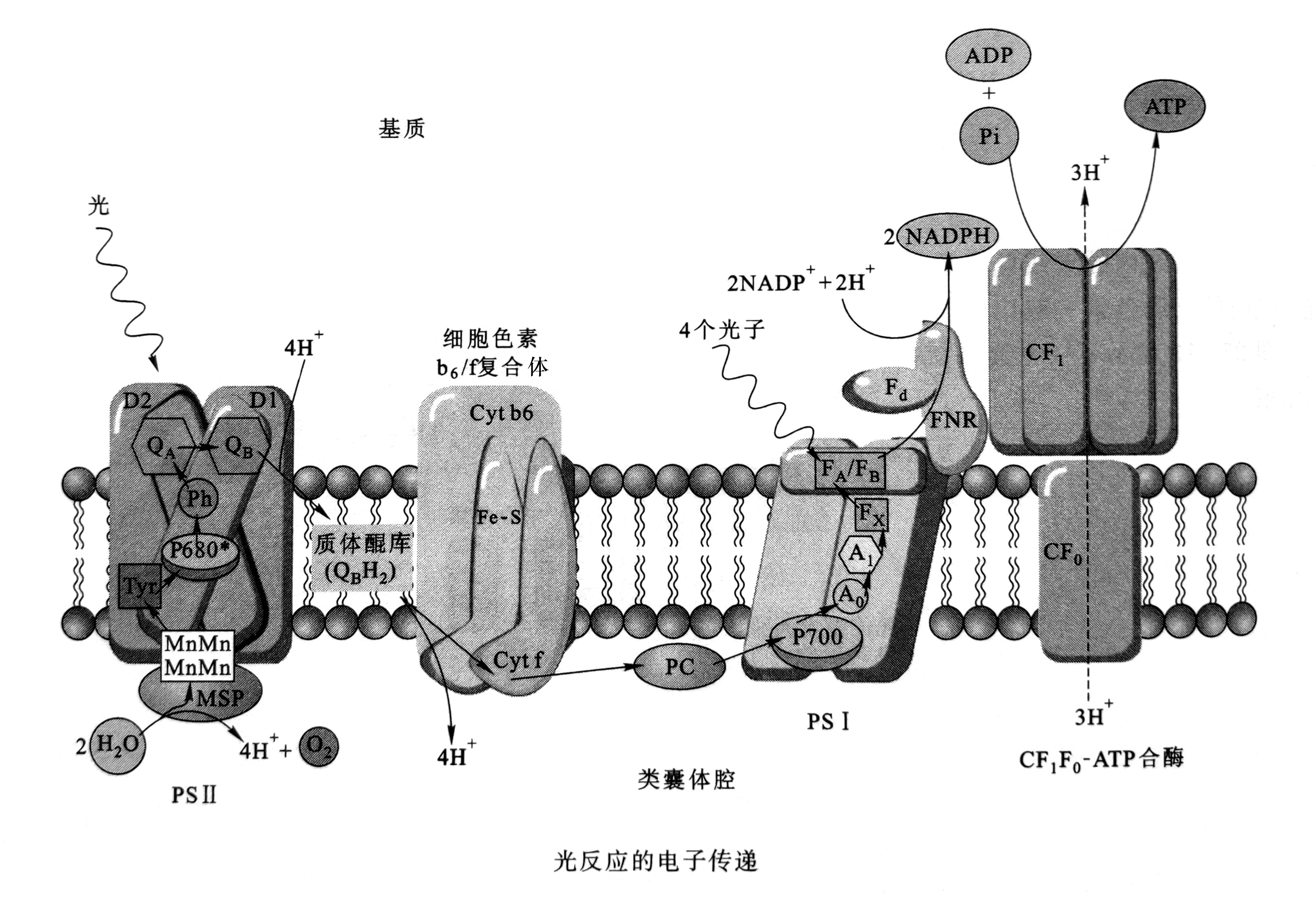 光系统Ⅱ中的天线色素分子吸收光,并将光能传递给反应中心P680,P680吸收能量后激发出一个电子,传给膜蛋白D1上的原初电子受体脱镁叶绿素(Pheo),然后将电子传给与膜蛋白D2结合的质体醌PQA,再传给与D1蛋白结合的另一个质体醌PQB。PQB在连续接受2个电子后,成为PQB2-,这时PQB2-从基质中摄取2个H+形成还原型PQBH2,PQBH2移到膜的内侧,将2个质子释放到类囊体腔中,而把电子交给细胞色素b6/f,随后又经过位于膜内侧的的质体蓝素(PC),把电子传递给P700。在上述电子传递时,来自水的电子经酪氨酸残基(Tyrz)传递到反应中心P680,水则被氧化分解为O2和H+。