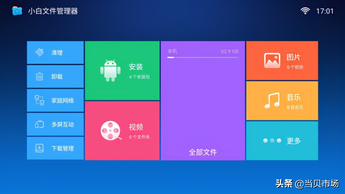 听这名字就知道他是专门为电视设计的文件管理器,其功能全面且易用,比小白管理器更适合电视。所有文件都先根据盘来分类,然后再按照音乐、视频、图片、安装包分类,可以让您可以快速地找到所需要的内容,不用再纠结于N级的文件目录。