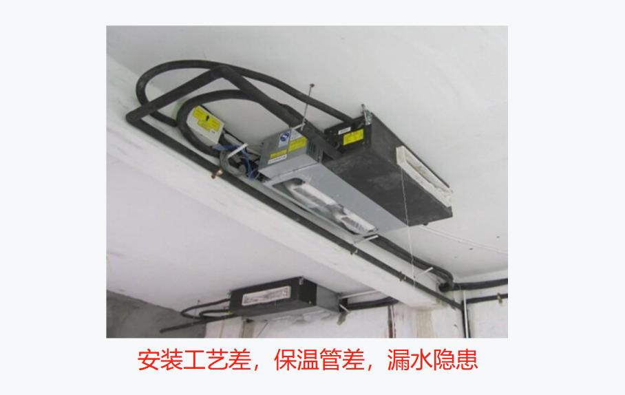 这样的情况,已经不是个例了,我在工作中常被“抓”去查看漏水原因,有时候就会遇见是使用了不好的保温管所致。因为铜管里是低温的氟利昂,保温管的目的是让铜管与热空气减少接触,而有些劣质保温管与铜管不贴合,存在缝隙,热空气进入就会产生冷凝水,冷凝水回顺着保温管管道流到低处而漏水;还有一种情况是保温管太薄,隔热性太差,铜管产生了冷凝水而漏水。
