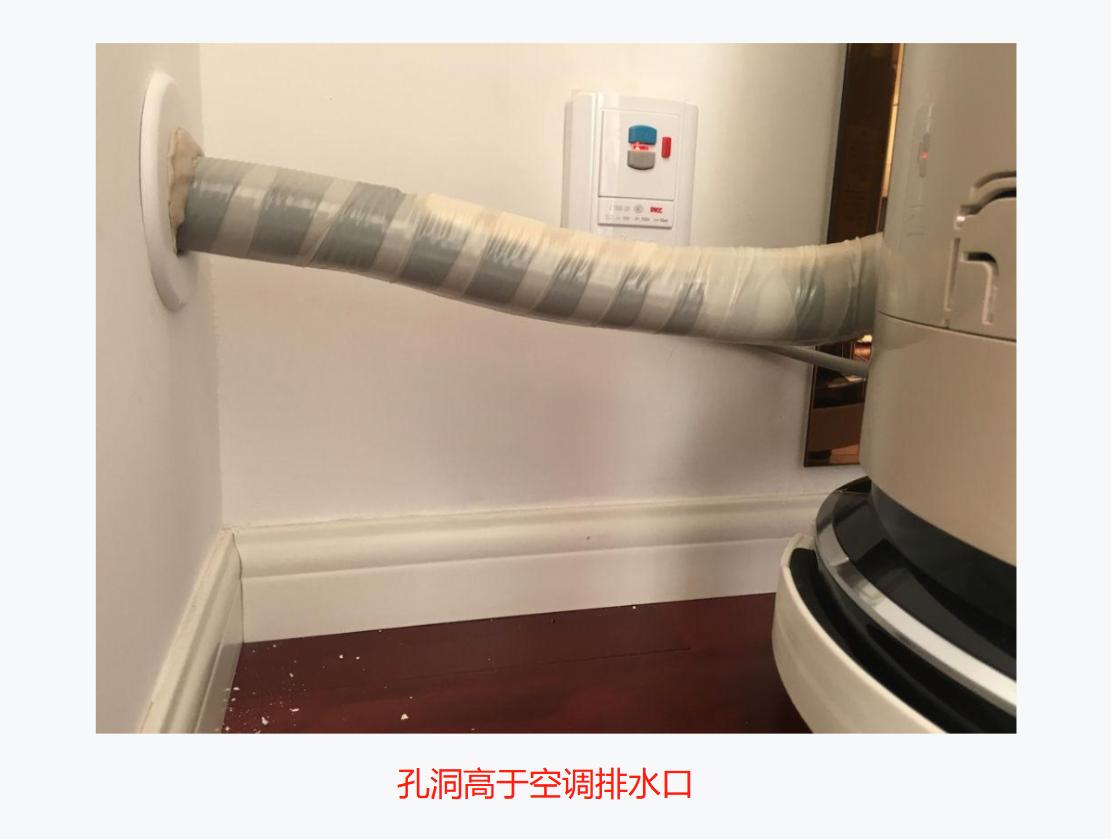 空调内机的机位安装,它是排水点的最高处,然后冷凝水才会顺着排水管排到室外,如果空调的排水口与路径中的管道任何一点平行,都有可能引起后期使用空调在制冷时而漏水。