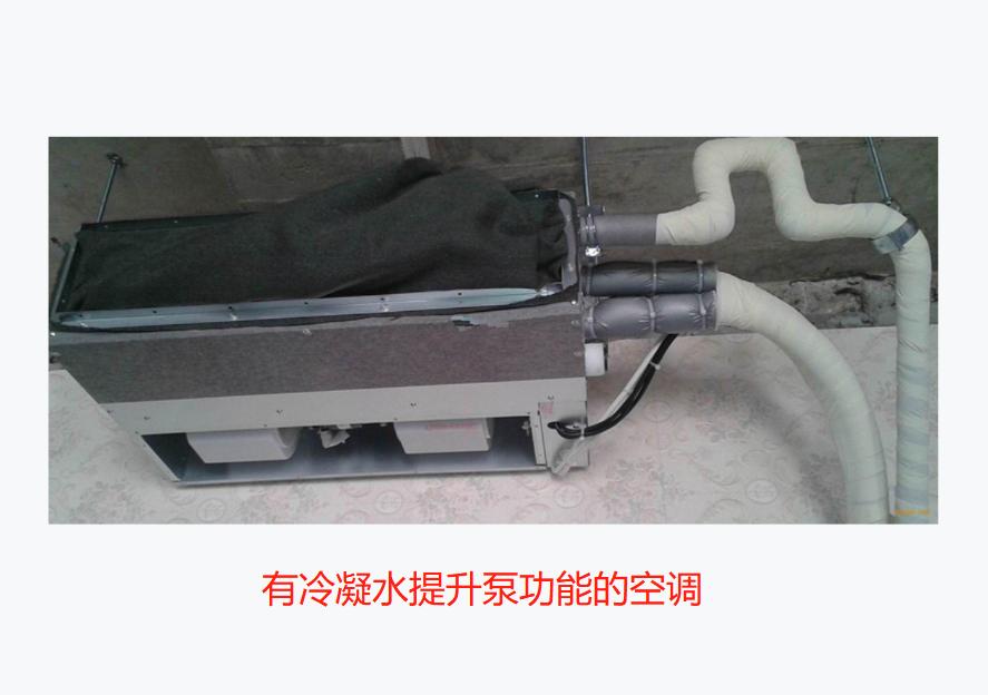 在暗藏空调里,有冷凝水提升泵功能内机,它是为了解决自然坡度排放冷凝水不能实施时,就可以把这台空调更换为具有冷凝水提升泵功能的机子,它内部有一个小型的水泵,可以提高冷凝水1-2米高,有这个功能,确实时有效的解决了排水冲突。