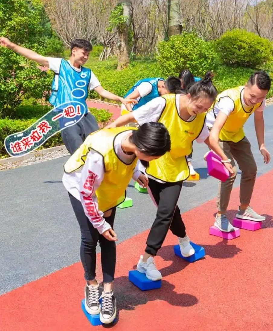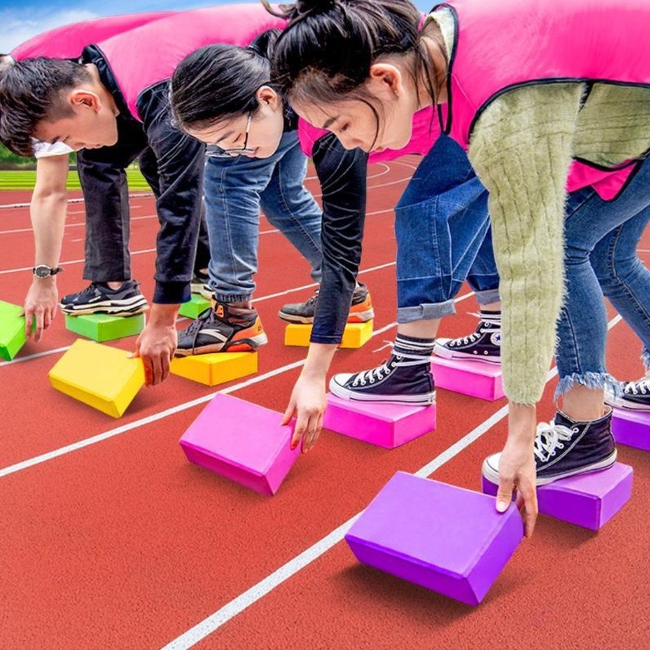 每人准备三块泡沫积木,从起点开始通过手不断的交换泡沫积木“搭桥”,一步一步通向终点,脚挨着地面从起点重新开始。