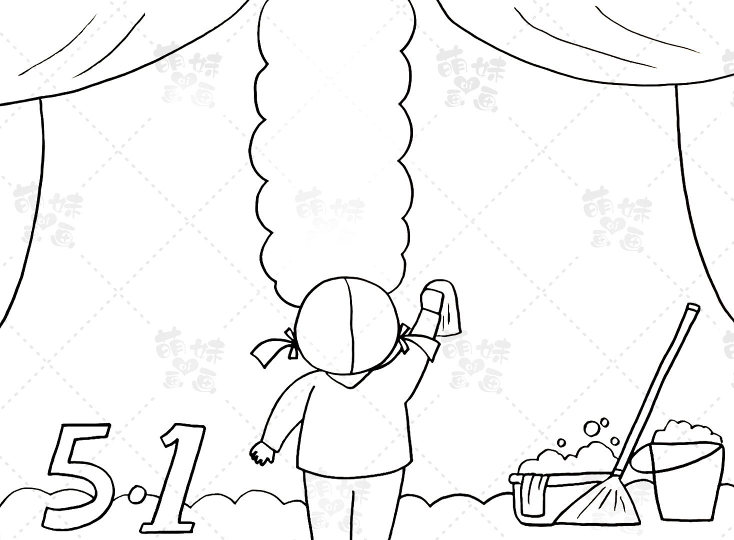 我们可以先在画面中间绘制一位打扫卫生的小女孩背影,用窗帘来作为手抄报的边框,用一些打扫卫生的工具来装饰我们的手抄报。