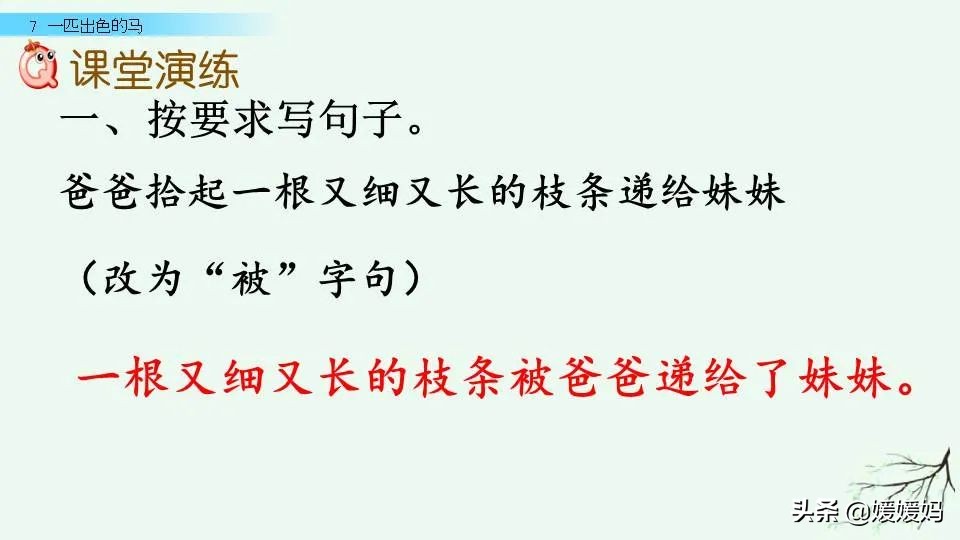 1.妹妹高兴地跨上“马”,蹦蹦跳跳地奔向前去。“马” 用双引号指的是它是用柳条做的,不是真正的马。“跨”和“蹦蹦跳跳” 体现写出妹妹高兴地接受了爸爸的建议。
