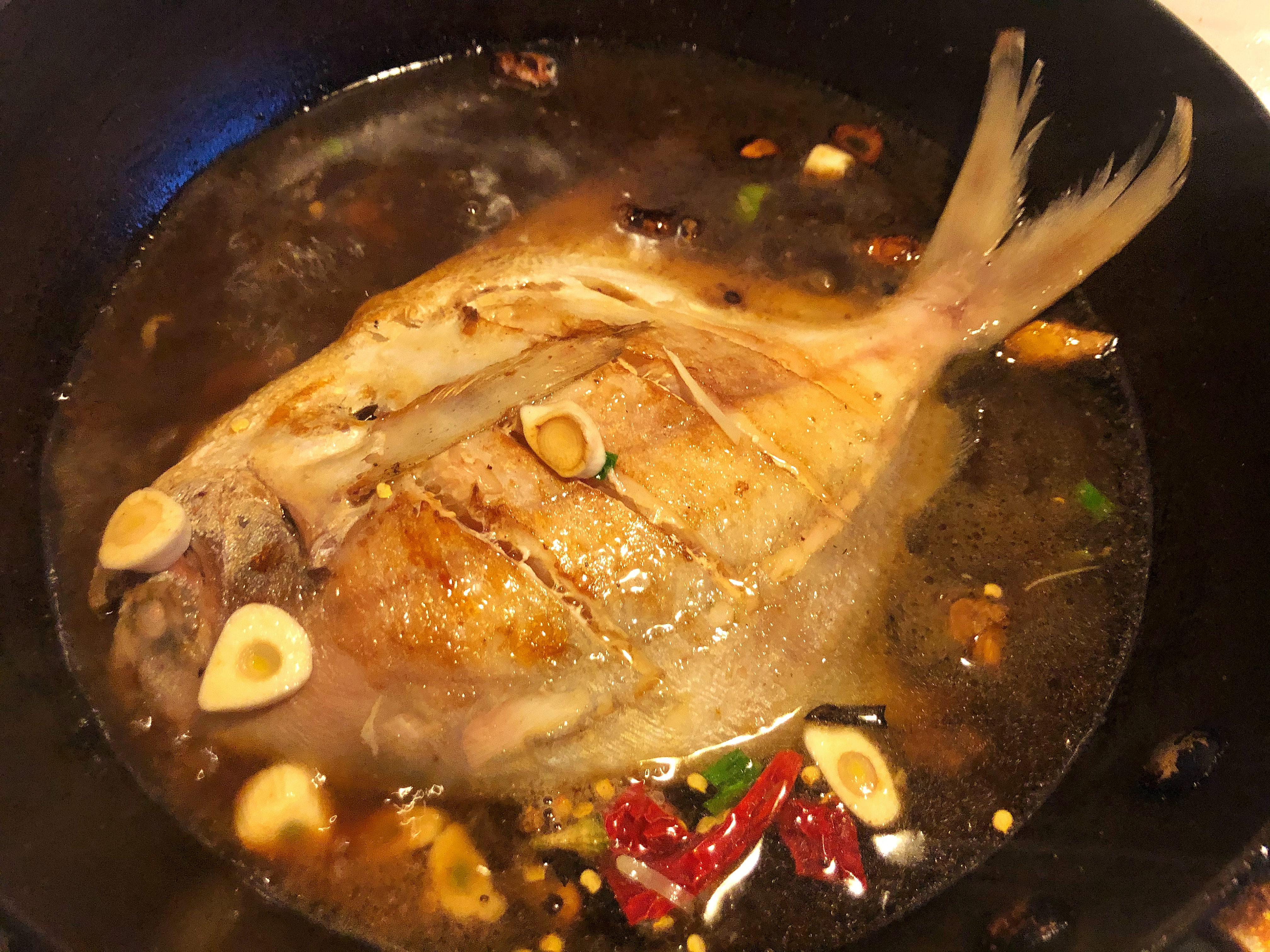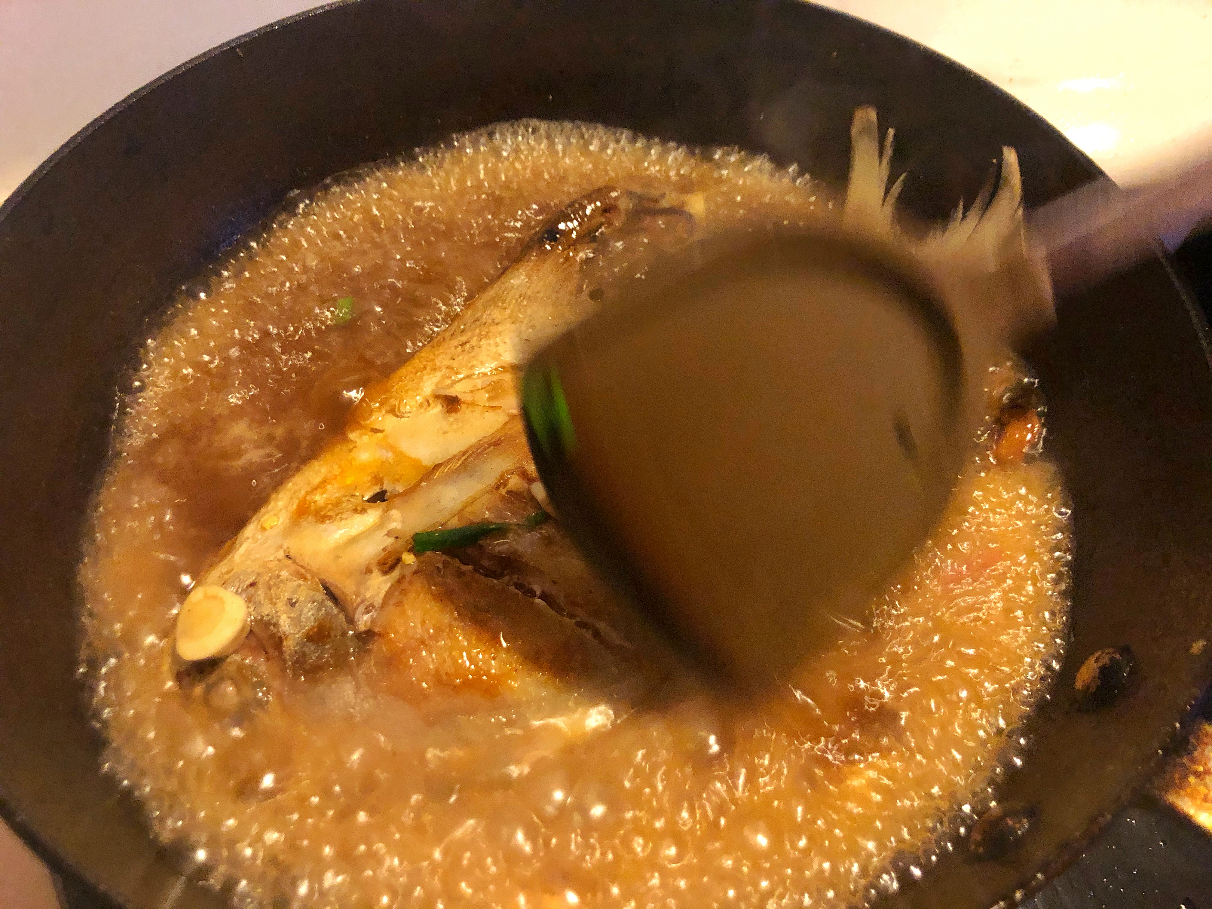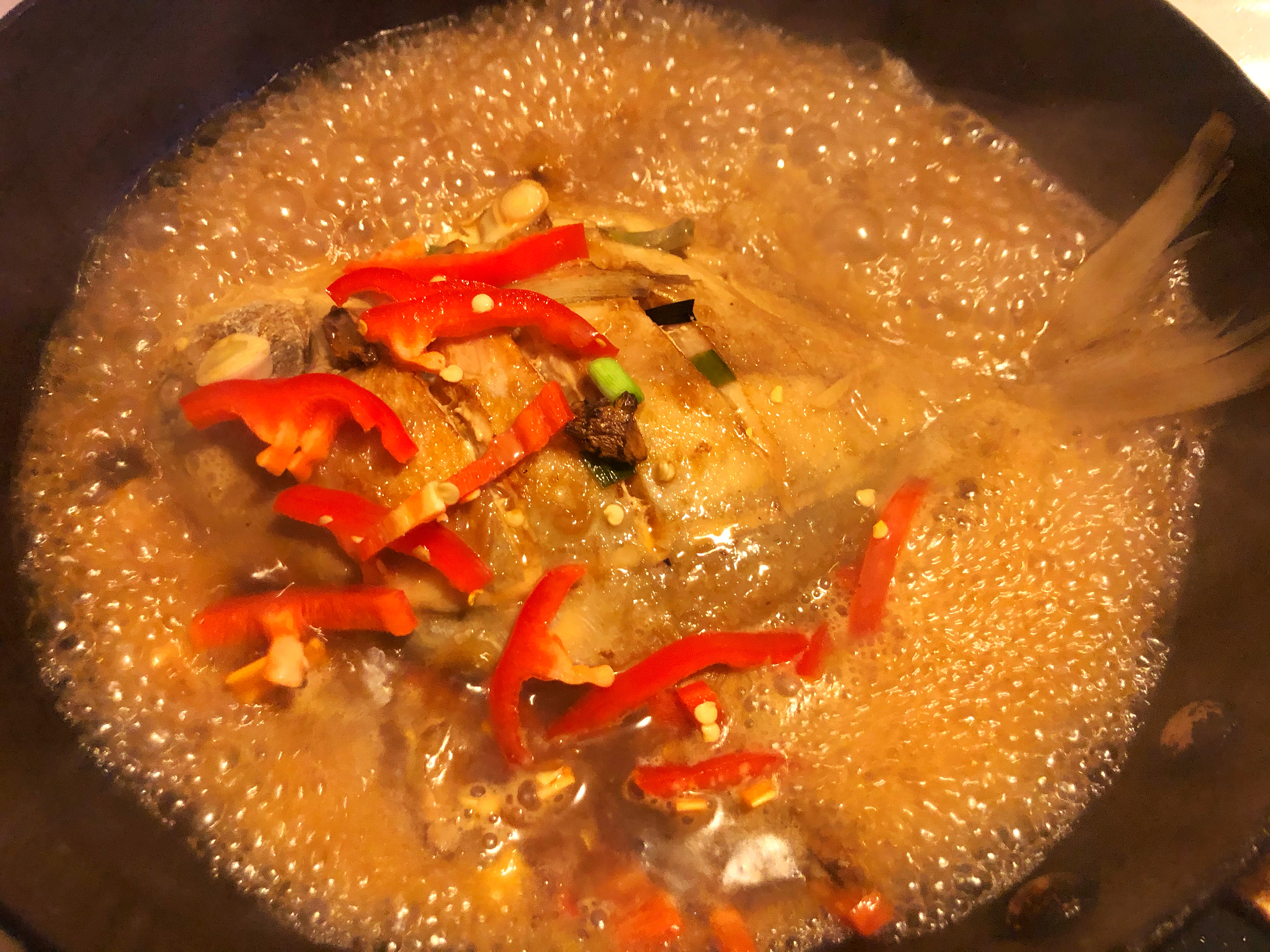 8、等汤汁煮沸了,加盖焖10分钟,再用铲子不断地将汤汁泼到鱼的表面,让汤汁入味