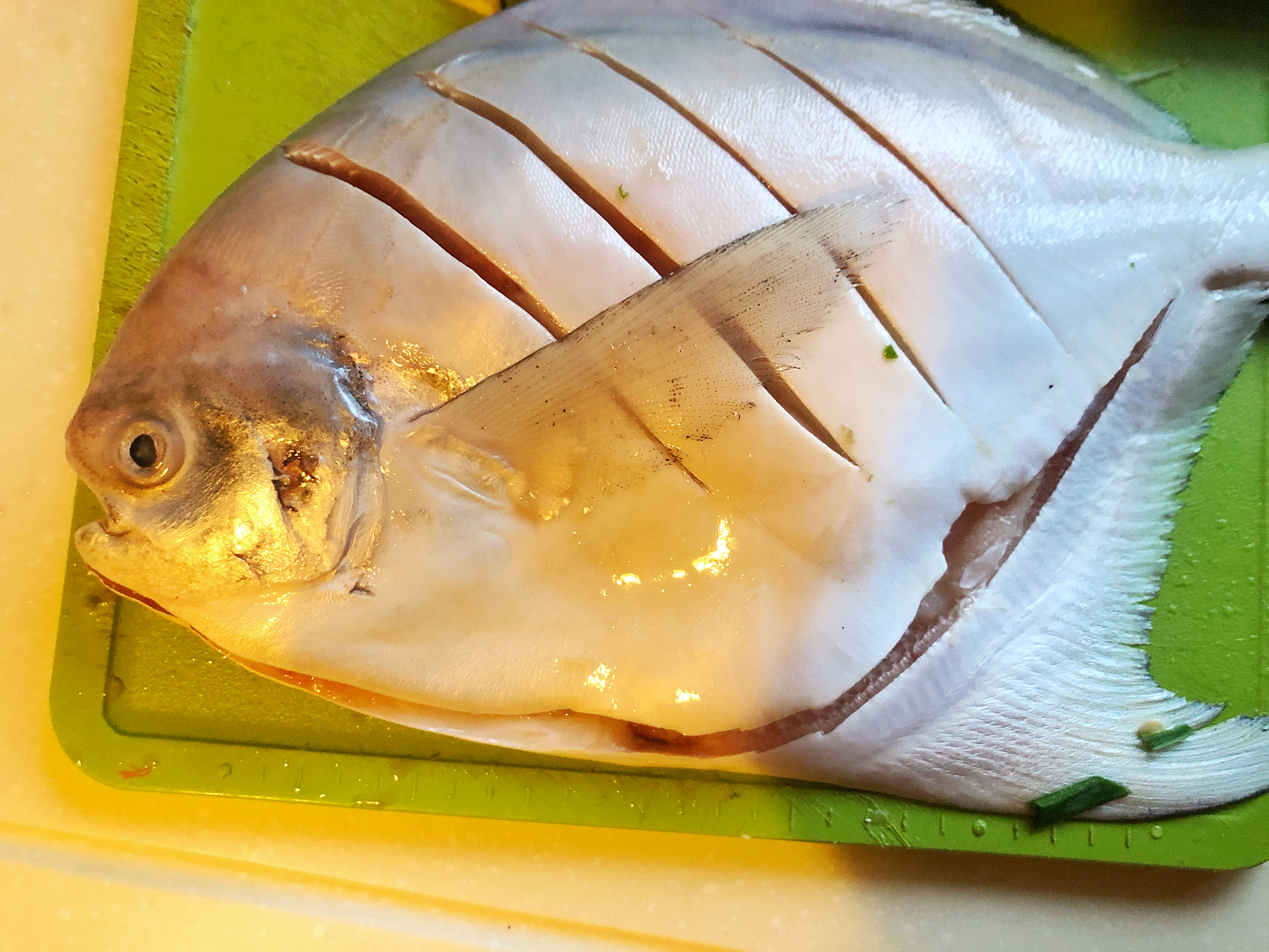 1、将鲳鱼的鱼鳃,鱼鳞和内脏去除,把鱼洗净,尤其是肚子里的黑膜,一定要清洗干净,不然会影响口感哦。再将鲳鱼的两面都划上四五刀,可以更好地让汤汁入味以及让鱼熟透