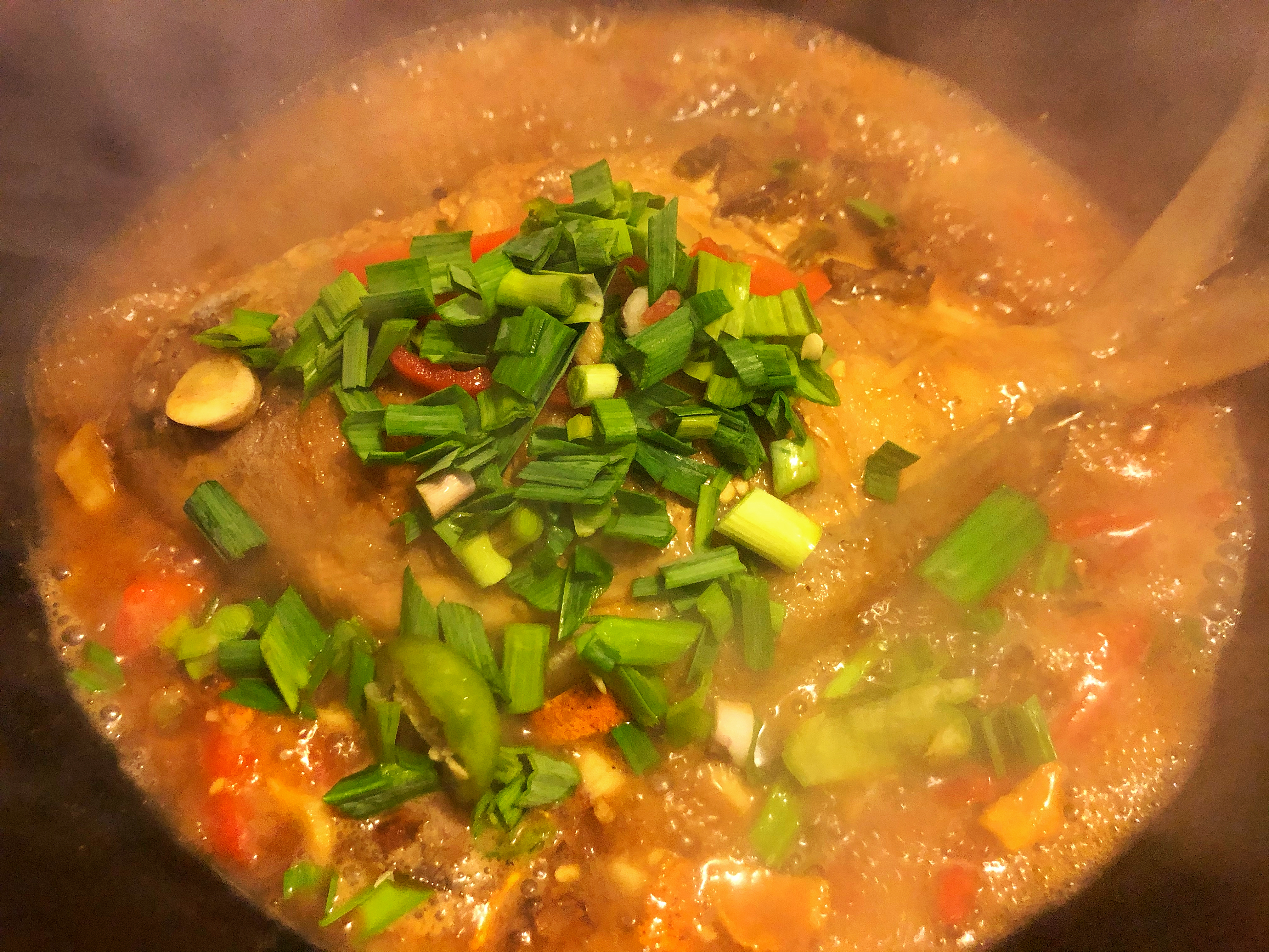 9、鱼熟了,加入鲜红辣椒,煮2分钟