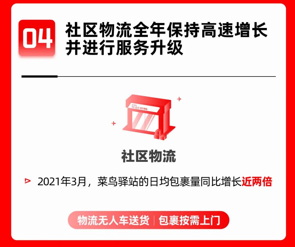 菜鸟心怀天下,也同样关注眼前与身边的需求。一直以来,快递最后一公里的服务质量一直是各家快递公司头疼的核心问题。菜鸟驿站经过几年的不断完善,服务不断升级,针对淘系包裹的按需上门让更多人开始选择菜鸟驿站作为其快递保管的唯一选择。2021年3月,菜鸟驿站日均包裹量同比增长近两倍。虽然最后一公里的问题还没有得到最完美的解决,但菜鸟在这方面的努力有目共睹。
