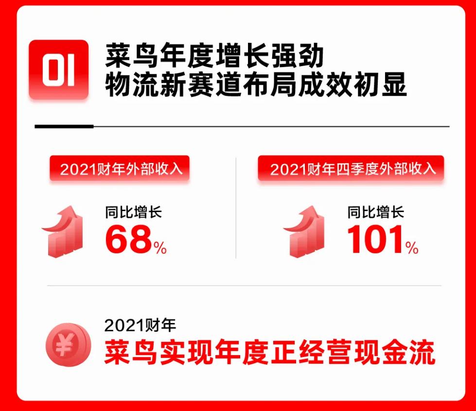 剔除与母公司阿里巴巴的关联交易,菜鸟本财年实现外部收入372.58亿元人民币,同比增长了68%;最新一季度外部收入99.59亿元人民币,同比增长是可怕的101%!