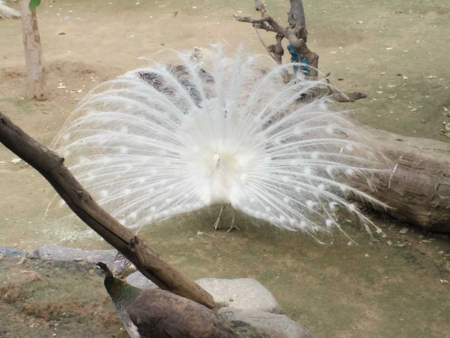 这个是孔雀开屏和旁边孔雀没有开屏的照片,有幸也看到了白色孔雀开屏的时候。