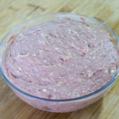 4、接着开始调味儿,姜末、蒜末、盐、糖、胡椒粉、生抽、土豆淀粉、泡打粉,接着继续绞打成细腻的肉泥,多搅打一会儿 ,一定要打得特别细腻才行;