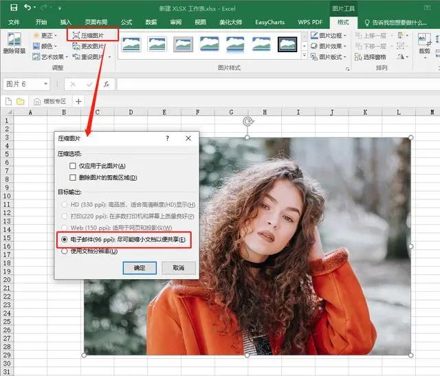 操作说明:在Excel中插入一张要进行压缩的图片,然后选中这张图片,点击【格式】-【压缩图片】-去掉其他勾勾-只勾选【电子邮件:可能缩小文档以便共享】即可!