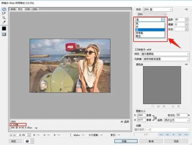 接着选择【储存为web所用格式】,这时候我们只需要在界面中根据自己的需要选择储存的图片质量,软件会根据我们选择的质量对图片进行相应的压缩。